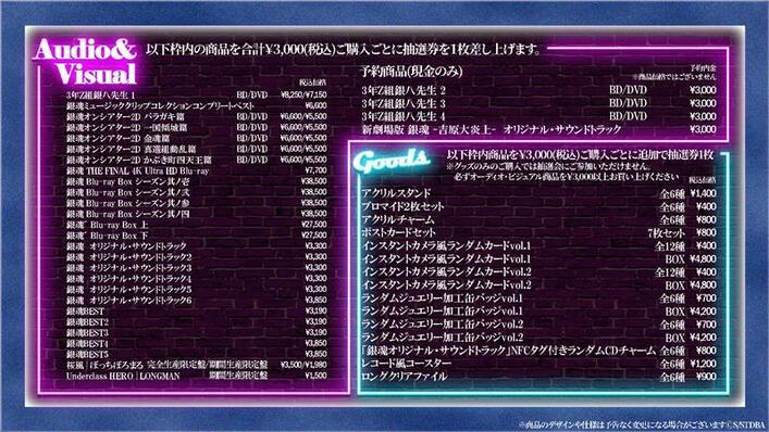 会場にて「銀魂」および「3年Z組銀八先生」のオーディオ・ビジュアル商品を含む関連商品をご購入のお客様に、豪華景品が当たる抽選会にご参加いただけます。