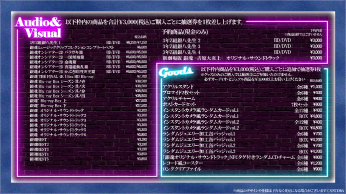 ◆参加方法:アニプレックス&ソニー・ミュージックブースにて【オーディオ・ビジュアル商品合計¥3,000以上(税込)】を含む「銀魂」「銀八先生」商品をご購入またはご予約¥3,000(税込)ごとに抽選券を1枚お渡しいたします。抽選券1枚ごとに抽選会に1回参加できます。