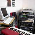 サントラ制作中。壁にはジンの世界を伝えるイラストやアートワークが貼られています。