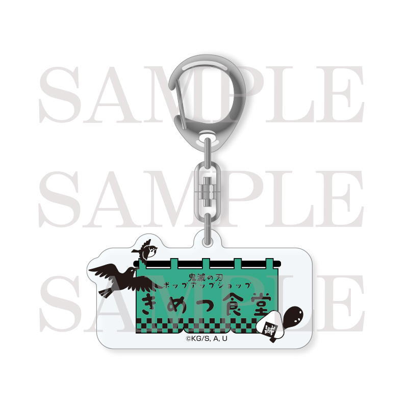 ロゴアクリルチャーム800円ロゴアクリルチャーム800円「きめつ食堂」のロゴデザインのアクリルチャーム。サイズ:W53mm×H28mm(アクリル部分のみ)材質 :(本体)アクリル樹脂(金具)亜鉛合金、鉄1会計につき3点まで