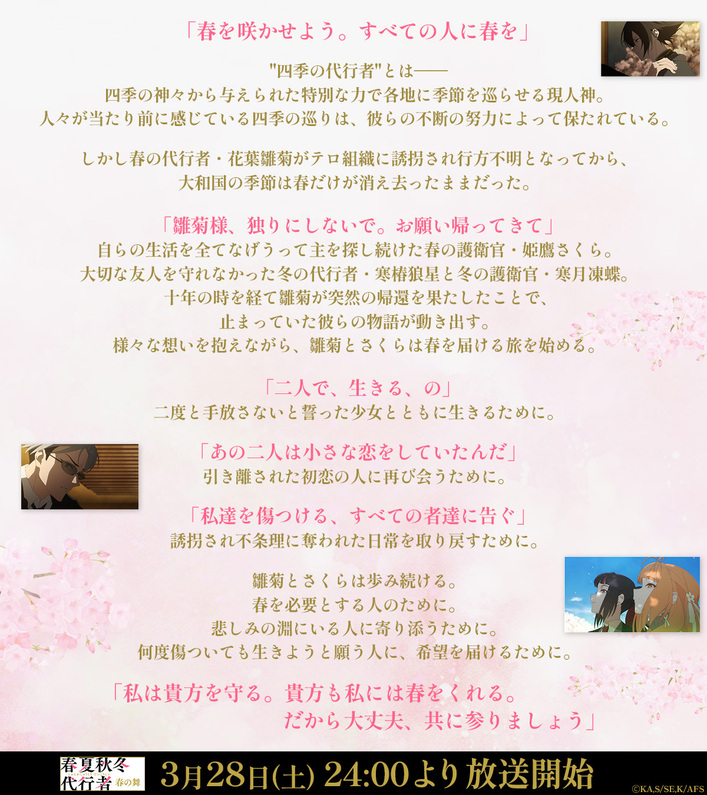 テロ組織に誘拐されていた春の代行者・花葉雛菊の帰還から始まる十年越しの物語。