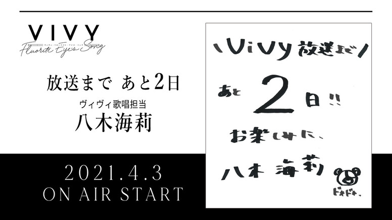 2021.04.01 【放送まであと2日】八木海莉さんからのカウントダウン色紙を公開しました 4月3日(土)の放送開始まで、毎日カウントダウン色紙を公開いたします。本日はヴィヴィの歌唱を担当する八木海莉さんからの色紙をご紹介。