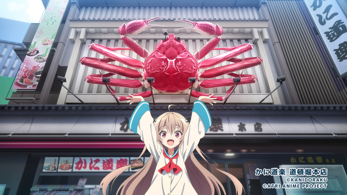 第6話のエンドカードが公開になりました。今回はなんと「かに道楽 道頓堀本店」!作品内でカニが大好きなアトリ。カニを捕まえたり食べたりと大好物のカニ繋がりにて、今回かに料理の専門店である「かに道楽」とのコラボが決定しました。「かに道楽」は、大阪の道頓堀で1960年に創業。以来、かに料理一筋で現在に至っており、かに料理に対する美味しさへの探求心は今もなお受け継がれています。今回はその道頓堀本店を背に、目印である巨大なカニの看板と一緒にポーズするアトリのイラストが、スタジオTROYCAによる描き下ろしにて実現しました。