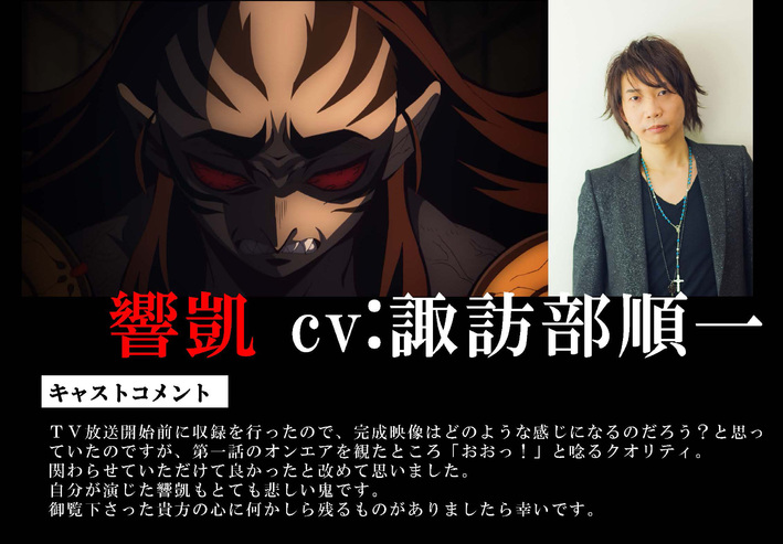 2019.06.10 鼓の鬼・響凱のキャストを解禁!! 第11話より炭治郎たちの前に立ちはだかる鼓の鬼・響凱のキャストを解禁!響凱 cv:諏訪部順一【響凱キャスト解禁PV】https://youtu.be/g0aENW8aQOg