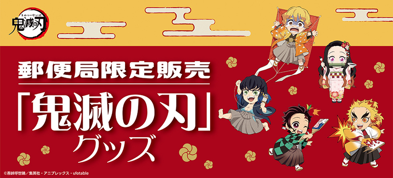 お正月衣装に身を包んだ炭治郎たちのufotable描き下ろしイラストや等身イラストを使用した年賀状や通帳ケースやふせんセットなどの限定グッズ、フレーム切手セットなど多数登場!