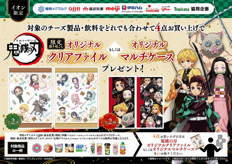 10月28日(水)から全国の総合スーパー「イオンリテール」(本州・四国限定)で、対象のチーズ製品・チルド飲料をどれでも合わせて4点お買い上げの方に、キャンペーン限定「鬼滅の刃」オリジナルクリアファイルもしくはオリジナルマルチケースを1つプレゼントいたします!デザインは全4種です。