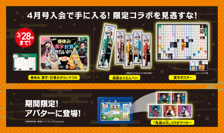 「進級に向けて全集中!」を応援するため、4月から小学1年生~6年生になる方を対象に、TVアニメ「鬼滅の刃」と学べる教材やキャラクター達がデザインされたオリジナル文具を期間限定で提供致します。
