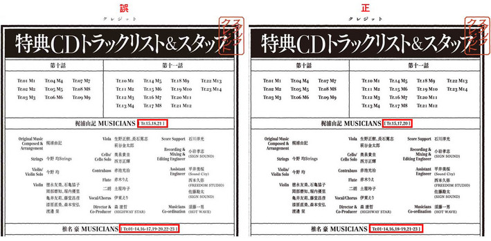 誤:梶浦由記MUSICIANS Tr.15,18,21 椎名豪MUSICIANS Tr.01-14,16-17,19-20,22-23