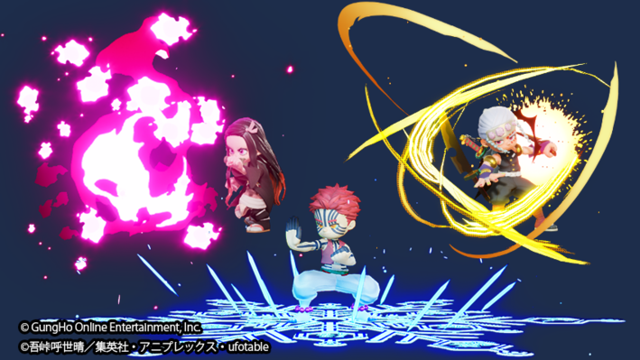 コラボガムウェポンでバトルでき、壱ノ型 水面斬りや肆ノ型 響斬無間、血鬼術 爆血などをエモーションで繰り出せます。