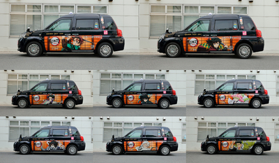 計8名のメインキャラクターをあしらった8種類の限定ラッピングタクシーが
