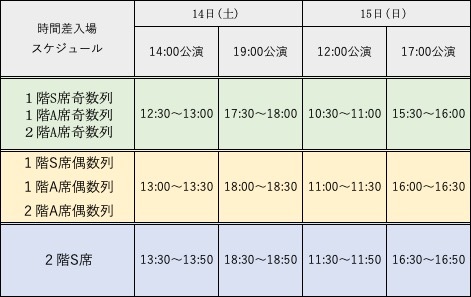 ご来場前に予めお手持ちのチケット券面に記載されている席種・座席番号をご確認いただき、下記該当時間内でのご入場にご協力をお願いいたします。