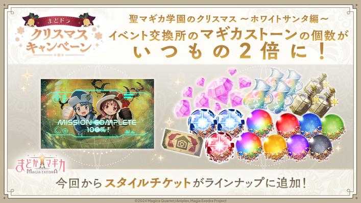 「聖マギカ学園のクリスマス ~ホワイトサンタ編~」のイベント交換所は、クリスマスキャンペーンとして「マギカストーン」が通常の2倍に増量し、合計1200個獲得可能となっています。