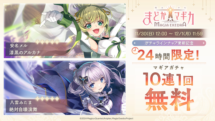 11月30日(日)12時より、ガチャラインナップの更新を記念して、24時間限定でマギアガチャが10連1回無料で引くことができます。