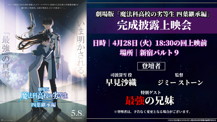 劇場版「魔法科高校の劣等生 四葉継承編」完成披露上映会の開催が決定しました!本イベントには、司波深雪役の早見沙織とジミー ストーン監督が登壇するほか、“最強の兄妹”も登場?!