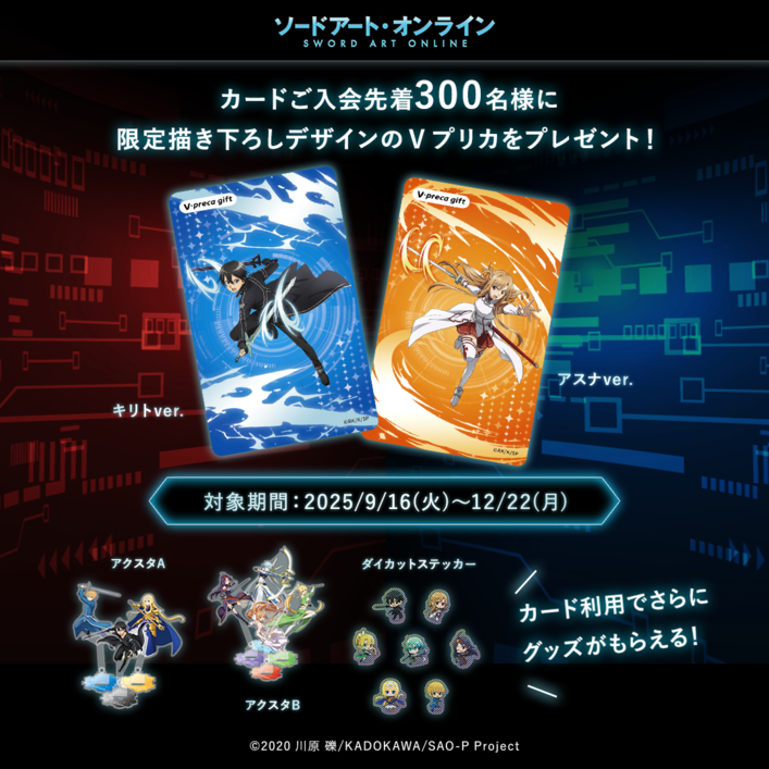 ②「ソードアート・オンライン」オリジナルグッズがもらえます。キャンペーンの詳細はカードのページ下部のお申し込みページよりご確認ください。