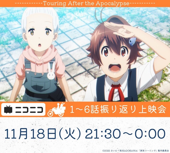 ニコニコ生放送にてアニメ「終末ツーリング」1~6話の振り返り上映会が決定いたしました。11月18日(火)21:30よりこれまでのヨーコとアイリの旅を一挙に振り返ることができます。