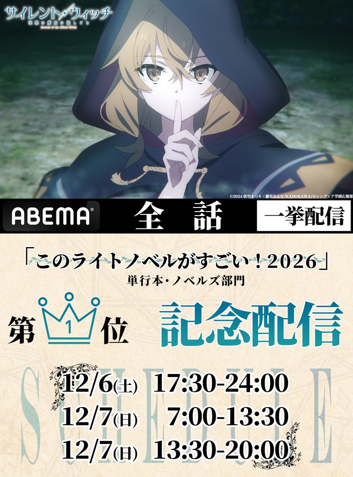 『サイレント・ウィッチ』の「このライトノベルがすごい!2026」単行本・ノベルズ部門1位獲得を記念して、ABEMAにて「サイレント・ウィッチ 沈黙の魔女の隠しごと」全13話一挙配信の実施が決定いたしました。