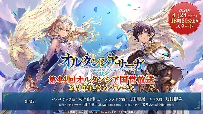 シリーズ6周年を記念して『オルタンシア・サーガ』の第44回国営放送をお届けします。初代MCを務めていた上田麗奈さんや乃村健次さんをお招きして、ゲームやTVアニメ、国営放送のこれまでを振り返ります!また、6周年記念ミニストーリー、オルサガの展開に関する重大発表と、オルサガを遊んでくださったユーザー様への感謝をお届けする番組となります! 視聴者プレゼントは豪華アイテムもご用意しておりますので、ぜひご視聴ください。