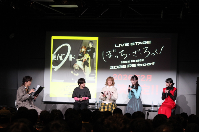 の告知が出ると、大歓声と拍手が場内から上がった。タイトルは【LIVE STAGE「ぼっち・ざ・ろっく!」2026 RE:boot】「再構築、作り直す」の「リブート」の名の通り、2024年の公演ではPART Ⅰ STARRY/PART Ⅱ 秀華祭と2本に分けた舞台を再構成し、1本にまとめた新作の舞台にするということだ。