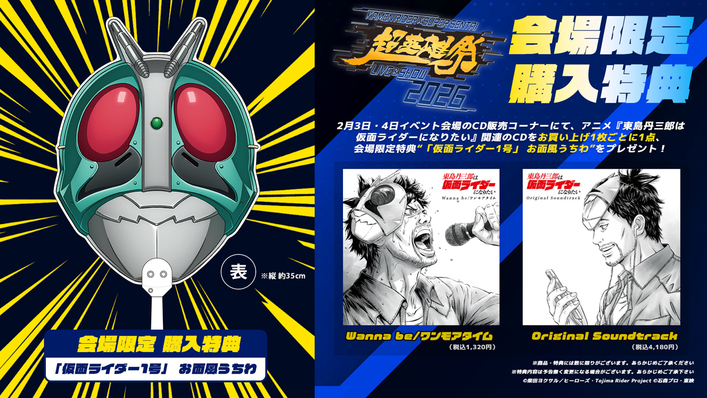 2月3日(火)および 2月4日(水)開催の「超英雄祭 KAMEN RIDER × SUPER SENTAI LIVE & SHOW 2026」では、会場のCD販売コーナーにて、アニメ『東島丹三郎は仮面ライダーになりたい』関連のCDをお買い上げ1枚ごとに1点、会場限定特典“「仮面ライダー1号」 お面風うちわ”をプレゼント!この機会に、ぜひお求めください。