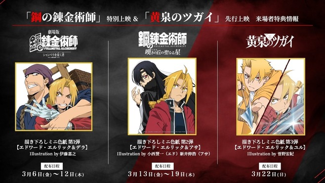 「鋼の錬金術師」劇場2作品の特別上映と連動し、来場者特典には「鋼の錬金術師」×「黄泉のツガイ」特別上映描き下ろしミニ色紙を配布いたします!
