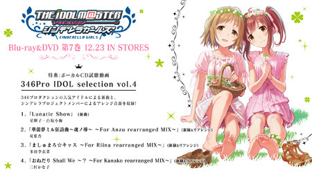 2015.12.07 Blu-ray&DVD第7巻 完全生産限定版特典「ボーカルCD:346Pro IDOL selection vol.4」試聴開始! アイドルマスター シンデレラガールズ 12月23日に発売するBlu-ray&DVD第7巻の完全生産限定版特典「ボーカルCD:346Pro IDOL selection vol.4」の試聴を開始しました。第7巻特典CD試聴はコチラ