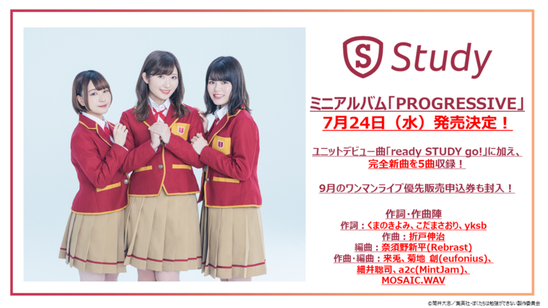アニメのOP/EDテーマは、曲に画もつくということもあり、自然と楽曲と本編のイメージが近くなると思うんです。それがユニットのミニ・アルバムになった場合、楽曲を聴いてどれだけ作品の雰囲気や世界観がお客さんにどこまで伝わるのかなという興味がまずありますね。しかも作家陣のみなさんが表現力ある方ばかりで、その人たちが描いた『ぼく勉』やStudyがお客さんにはどんな色に見えるのかというのは想像するだけですごく楽しいし、音楽が作品をバックアップして、どう表現することができるのかと考えるのもすごく楽しいです。そんな、音楽で『ぼく勉』やStudyというものを表現したミニ・アルバム『PROGRESSIVE』を楽しみにしていただければと思います