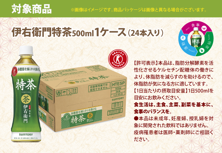 ※景品が取り付けてある「サントリー伊右衛門特茶500ml1ケース(24本入り)」が対象。