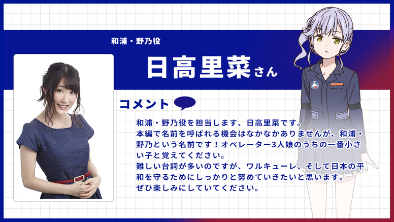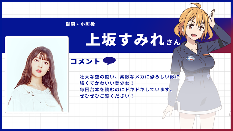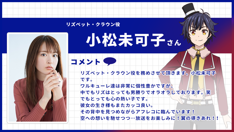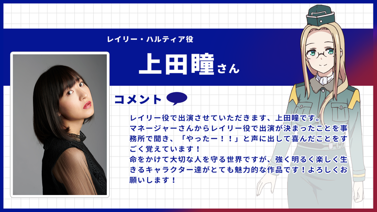 2020.07.22 キャスト情報第2弾が公開!コメントも到着! 戦翼のシグルドリーヴァ 第2弾となるキャスト情報が解禁! ルサルカ・エヴァレスカ:茅野愛衣リズベット・クラウン:小松未可子レイリー・ハルティア:上田瞳本庄・美智:堀江由衣和浦・野乃:日高里菜御厨・小町:上坂すみれ