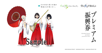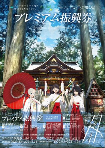 秩父が舞台のアニメ三部作「空の青さを知る人よ」「心が叫びたがってるんだ。」「あの日見た花の名前を僕達はまだ知らない。」と「三峯神社」とのコラボを実現した、オリジナル描き下ろしイラストのプレミアム振興券が、三峯神社、秩父市内にて絶賛発売中です。