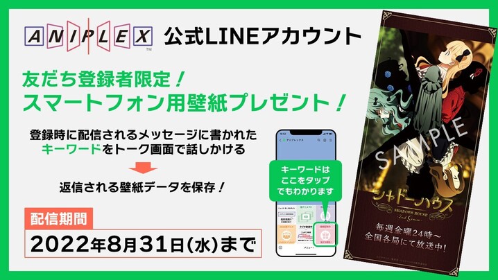 8月は「TVアニメ「シャドーハウス」-2nd Season- 」壁紙プレゼント(アニプレックス公式LINE)