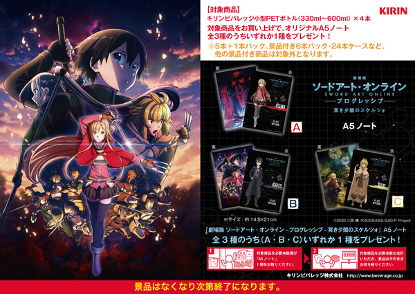 本州・四国の総合スーパー「イオン」(北海道・九州・沖縄を除く)にて、「劇場版 ソードアート・オンライン -プログレッシブ- 冥き夕闇のスケルツォ」キリンビバレッジ「まとめ買いキャンペーン」が開催決定!対象製品をお買い上げいただいたお客さまに、「劇場版 ソードアート・オンライン -プログレッシブ- 冥き夕闇のスケルツォ」オリジナルA5ノート 全3種のうち、いずれか1種をプレゼントします!
