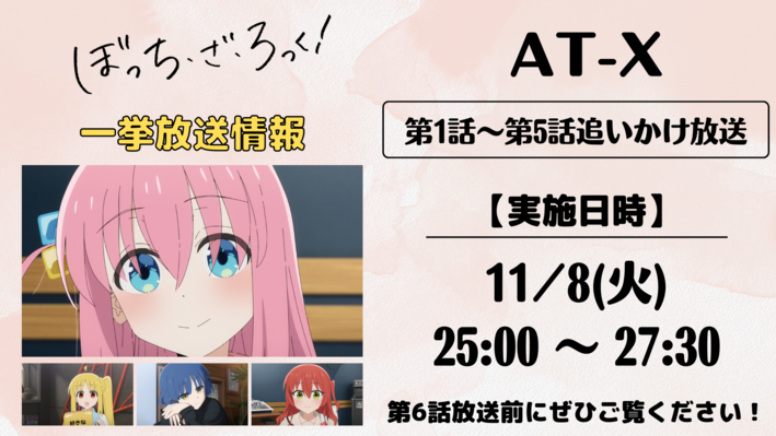 2022.10.27 【一挙放送】AT-Xにて第1話~第5話追いかけ放送の実施が決定! ぼっち・ざ・ろっく! AT-Xにて第1話~第5話の追いかけ放送の実施が決定いたしました!【実施日時】 11月8日(火) 25:00~27:30第6話の放送前にぜひご視聴ください!