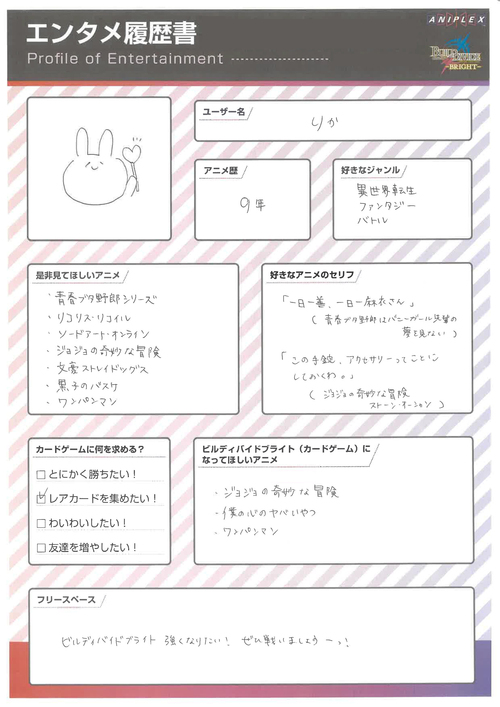 「好きなアニメのセリフ」や「カードゲームに何を求める?」など個性的な履歴書を作成できるページを公開!