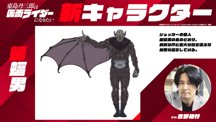 2025.10.25 新キャラクター「蝙蝠男」登場!声優は吉野裕行さんに決定! 東島丹三郎は仮面ライダーになりたい 本日放送・配信の第3話にて新キャラクター”蝙蝠男”が登場しました。声優は吉野裕行さんに決定!今後の展開にぜひご期待下さい。島村兄弟の祖父と祖母を惨殺したショッカーの怪人。蝙蝠男の名のとおり、鋭利な爪と巨大な羽を備えた凶悪な姿をしている。