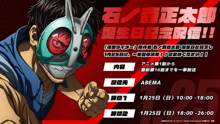 1/25が「仮面ライダー」原作者・の石ノ森章太郎先生の誕生日であることを記念して、アニメ『東島丹三郎は仮面ライダーになりたい』の一挙配信が決定しました。第1話から最新第16話までを、ABEMAにて1日2回放送します。この機会にぜひ、ご視聴ください。