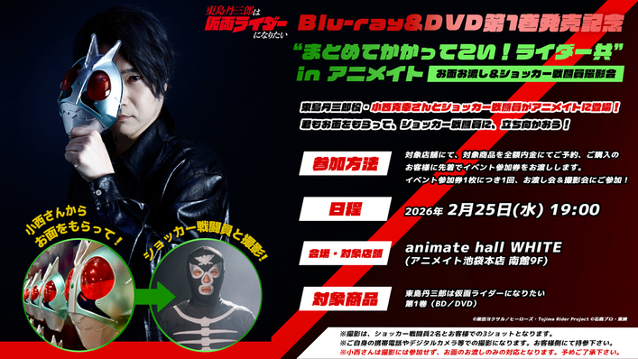 Blu-ray&DVD第1巻の発売を記念して、東島丹三郎役・小西克幸さんとショッカー戦闘員が店頭に登場します!この機会に君もライダーになってショッカー戦闘員に立ち向かおう!アニメイト池袋本店でBlu-ray&DVDをご予約・ご購入いただいた方は、無料でイベントにご参加いただけます。ぜひ!ご期待ください!