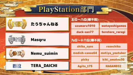 2026.03.04 『「鬼滅の刃 ヒノカミ血風譚2」第弐回 公式オンライン大会 ~最強への道~』上位入賞者が決定! 鬼滅の刃 ヒノカミ血風譚2 2月28日(土)に開催された『「鬼滅の刃 ヒノカミ血風譚2」第弐回 公式オンライン大会 ~最強への道~』にて、上位入賞者が決定しました!■大会の様子はこちら■大会の結果〇Nintendo Switch部門〇PlayStation部門大会にご参加いただいた選手の皆さま、配信をご覧いただいた皆さま、誠にありがとうございました!■今回大会の概要 >『第弐回 公式オンライン大会 ~最強への道~』開催決定!本日よりエントリー開始!