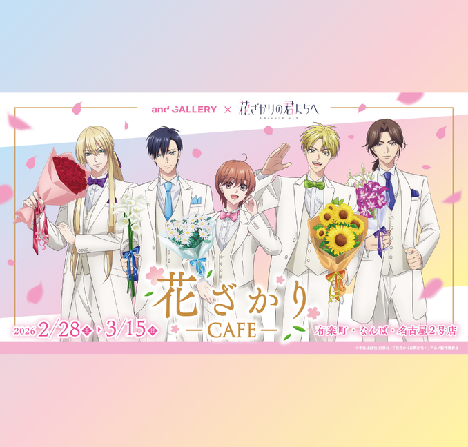「花ざかりCafe」が2026/2/28(土)~3/15(日)の期間限定で、and GALLERY有楽町店・なんば店・名古屋2号店にて大好評開催中です! カフェ限定の描き下ろしイラストを使用したグッズやノベルティの販売、作品をイメージしたコラボメニューがお楽しみいただけます。 皆様のご来店をお待ちしております。 |