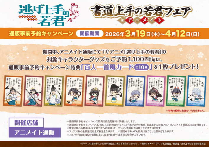 概要:期間中、アニメイト通販にて、TVアニメ「逃げ上手の若君」の対象キャラクターグッズをご予約1,100円(税込)毎に、フェア特典「百人一首風カード(全10種)」を1枚プレゼント!