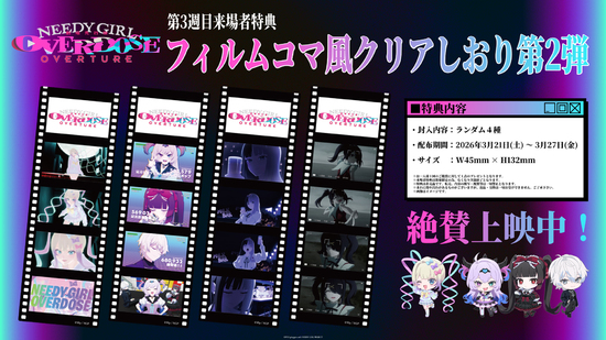 絶賛上映中の劇場先行版『NEEDY GIRL OVERDOSE -OVERTURE-』の第3週目来場者特典は、「フィルムコマ風クリアしおり 第2弾(ランダム4種)」に決定いたしました!