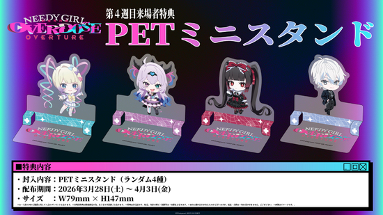 絶賛上映中の劇場先行版『NEEDY GIRL OVERDOSE -OVERTURE-』の第4週目来場者特典は、「PETミニスタンド(ランダム4種)」に決定いたしました!