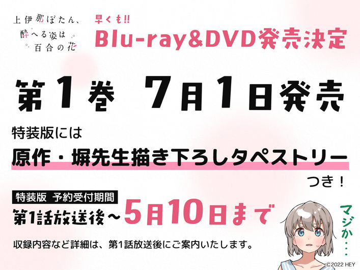 2026.03.29 Blu-ray&DVD発売決定! 上伊那ぼたん、酔へる姿は百合の花 第1巻は7/1(水)に発売いたします。特装版は原作・塀先生描き下ろしタペストリーつきとなっております。特装版予約:第1話放送終了後~5/10(日)まで詳細は第1話放送後にお知らせいたします。