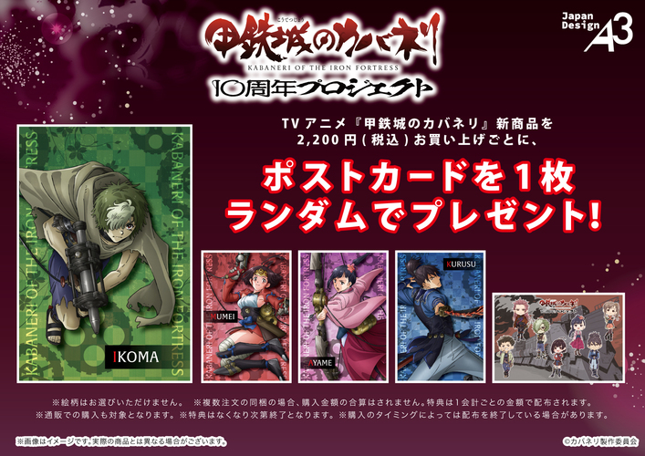 5月21日(木)~6月4日(木)の間、松屋浅草3階のAnime Culture Center by eeoにて『甲鉄城のカバネリ』アニメ放送10周年を記念した新商品を発売いたします!周年記念ビジュアルのほか、生駒や無名ら計8人が落書き風のグラフアートとなった新商品が登場!