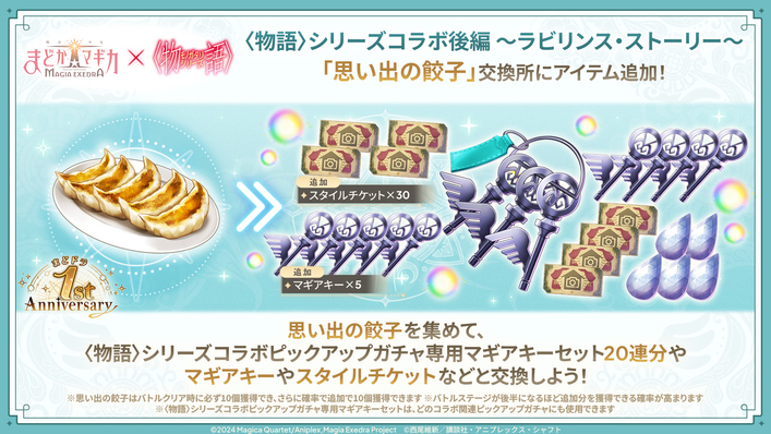 思い出の餃子を集めると交換できる「思い出の餃子交換所」はイベント前編・後編で共通となっており、忍野忍や八九寺真宵、斧乃木余接のキオクピックアップガチャをひくことができる「〈物語〉シリーズコラボピックアップガチャ専用マギアキーセット」を合計20連分交換することが可能です。その他にも、スタイルチケットやマギアキー、ペイントドロップなどを交換することが可能です。
