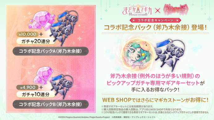 2026年4月14日(火)12時より、お得なパックの販売を開始し、マギカストーンと[例外のほうが多い規則]斧乃木余接のピックアップガチャ専用マギアキーセットが手に入ります。