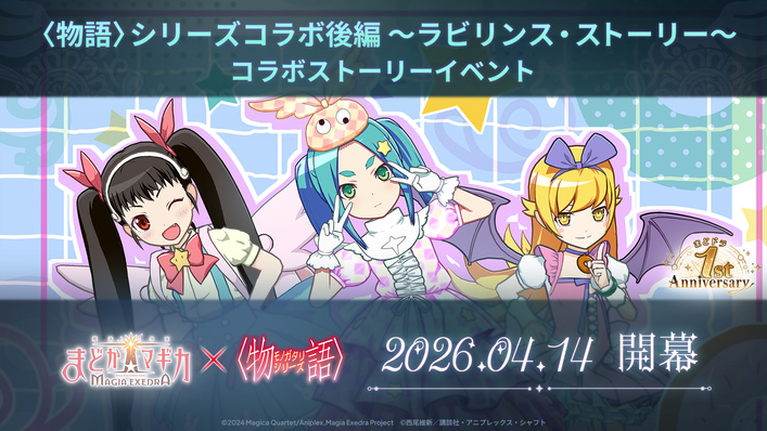 2026年4月14日(火)12時より、オリジナルの物語でお贈りするコラボストーリー「〈物語〉シリーズコラボ後編 ~ラビリンス・ストーリー~」を開始いたしました。コラボストーリーイベントとなっており、「もしも〈物語〉シリーズのヒロインたちが魔法少女になったら」という「if」の姿で、〈物語〉シリーズのヒロインたちがまどドラの世界に登場する完全オリジナルシナリオでお届けします。