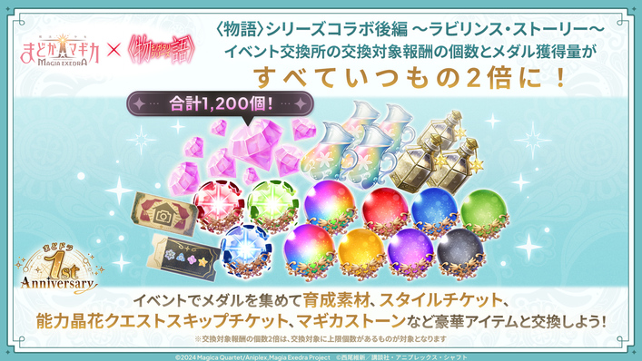 「〈物語〉シリーズコラボ後編 ~ラビリンス・ストーリー~」のイベント交換所は、コラボ記念キャンペーンとして、「マギカストーン」が通常の2倍に増量し、合計1,200個獲得可能となっています。その他、「オーブ」、「能力晶花クエストスキップチケット」なども通常の2倍獲得いただけます。