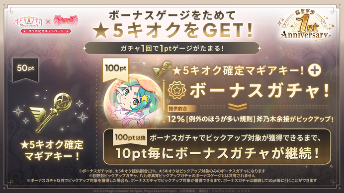 2026年4月14日(火)12時より、コラボ記念ミッション第2弾を開始いたしました。第1弾と第2弾のすべてのミッションをクリアすることで、「〈物語〉シリーズコラボピックアップガチャ専用マギアキーセット」を最大で40連分や、「プリズムオーブ」などを獲得いただけます。