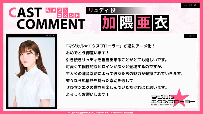「マジカル★エクスプローラー」アニメ化を記念して、リュディ役:加隈亜衣さんからコメントが到着しました!